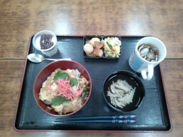 かつ丼・浅漬け・煮物・デザートと、盛りだくさんの食事でしたが、皆さん喜んで召し上がっておりました。