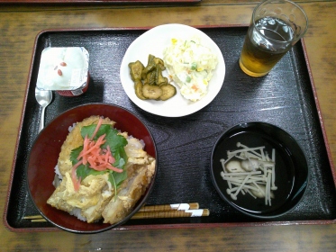 昼食には、カツ丼・ポテトサラダ・きゅうちゃん漬け・杏仁豆腐を美味しく頂きました!