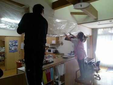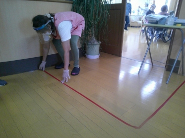 管理者が関連医療機関に報告し指示を受けフロアのゾーニング・フェイスシールド、予防衣着用など演習訓練を実施致しました.。