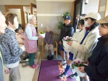 その一環として12月11日、にこにこ倶楽部へ6年の生徒さんが、心を込めたパンジーのお花を届けに来てくださいました。