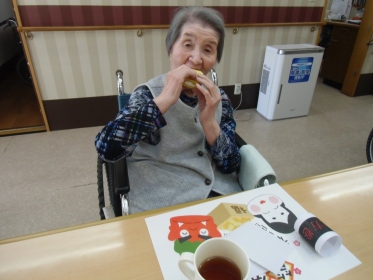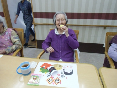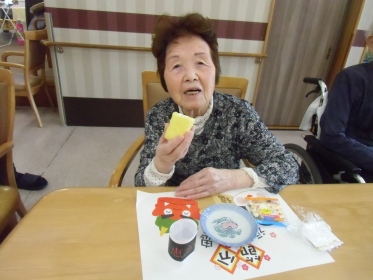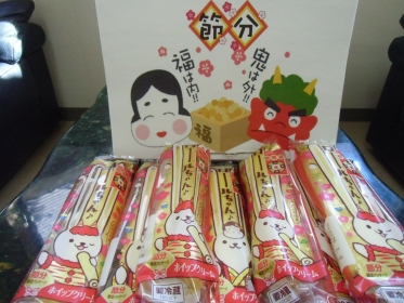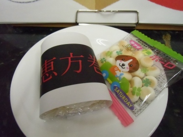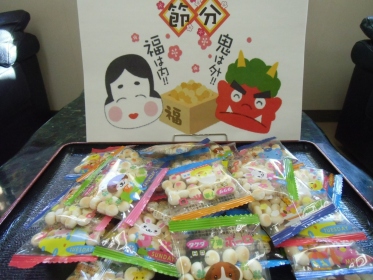恵方巻(ロールケーキ)豆(ボーロ)で節分行事を行いました。