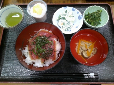 お昼はマグロの漬け丼、ほうれん草の白和え、春菊のごま和え、フルーチェ、お吸い物でした。