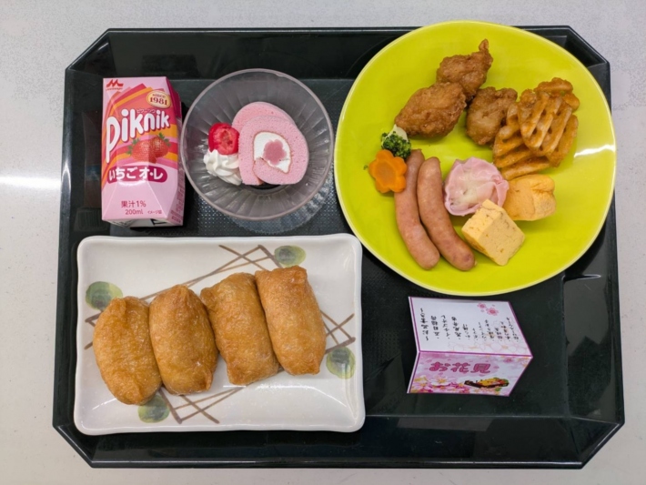 メニューは、五目稲荷・イチゴオレ・花見弁当(から揚げ・ポテト・ウインナー・厚焼き玉子・桜焼売・木の芽生え)・桜ロールケーキでした。
